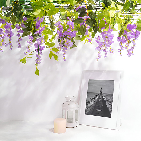 Искате да създадете впечатляващи цветни аранжировки? Ярколилавата глициния на WISBLOOM, в комплект с буйни зелени листа, е идеална за декорация на арки, решетки, стени, витрини, ресторанти, офиси, партита и др. Устойчиви на ултравиолетови лъчи и дълготрайни, тези цветя могат да се използват на закрито или открито, като добавят ярък щрих към всяка обстановка.