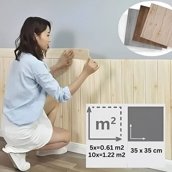 Всяка опаковка съдържа 5 броя (35 x 35 см), които покриват 0,61 m². Преди да започнете, изчислете колко опаковки ще са ви необходими въз основа на площта на стената. Закупете повече опаковки за по-големи пространства и се възползвайте от отстъпки за количество!