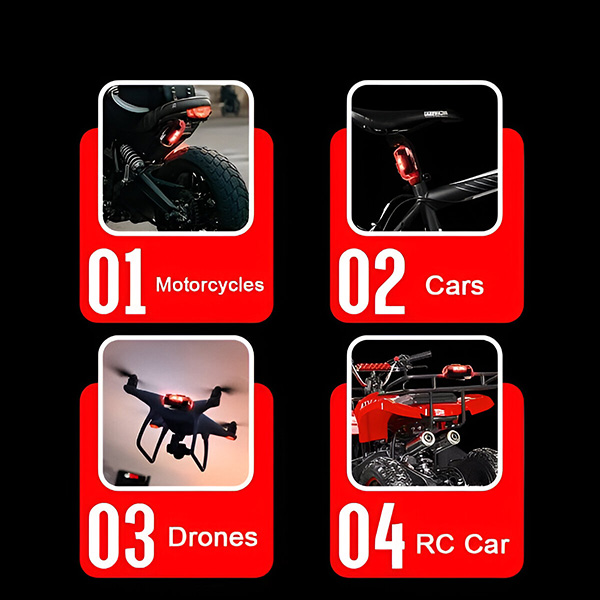 🔧 Монтират се за секунди – не са нужни инструменти – закрепват се с велкро подложки или гумени пръстени, подходящи за коли, мотоциклети, велосипеди, дронове, каски и раници.